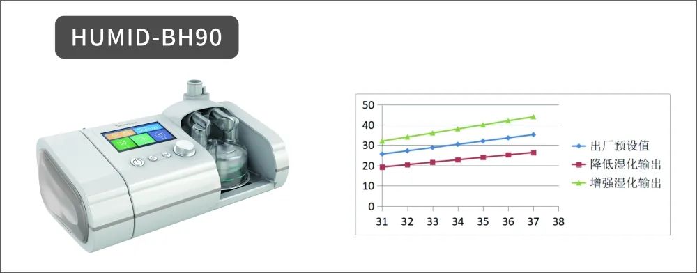 當低流量無法滿足患者氧療需求時,臨床通常會使用高流量的氧療設備進行呼吸支持。近年來國際上應用較為廣泛的高流量氧療設備是高流量呼吸濕化治療儀:通過無需密封的鼻塞導管輸送充分加溫加濕的濃度可設置(21%-100%)的高流量(高達90L/min)氣體的氧療方式。它提供的氣體流量≥患者吸氣峰流量,滿足患者氣體吸入量的需要,精準輸送設置的氧濃度(21%-100%),可以快速有效的改善氧合。同時,HUMID-BH系列可以對患者吸入空氧混合后的氣體進行29-37℃逐度的加溫加濕調節(jié),減輕呼吸道濕化的負荷,達到BTPS狀態(tài)。并且可根據患者的舒適度和耐受度,以及痰液黏稠度不同,進行濕化輸出飽和度(-3~+3)7檔微量調節(jié),使患者的氣道進行充分的溫濕化,接近飽和濕度。幫助保護維持患者正常的氣道黏膜的功能。
