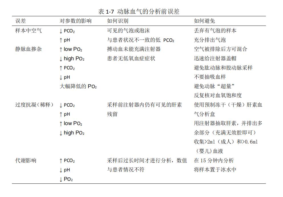 上機(jī)前將標(biāo)本前端的血排出1~2滴,防止微血栓對(duì)檢測(cè)的影響。血?dú)鈾C(jī)應(yīng)按照廠家要求定時(shí)定標(biāo)、定期維護(hù),以防檢測(cè)時(shí)出現(xiàn)故障,保證結(jié)果的準(zhǔn)確性(表1-7)。