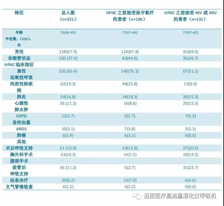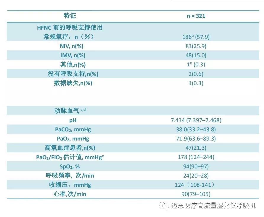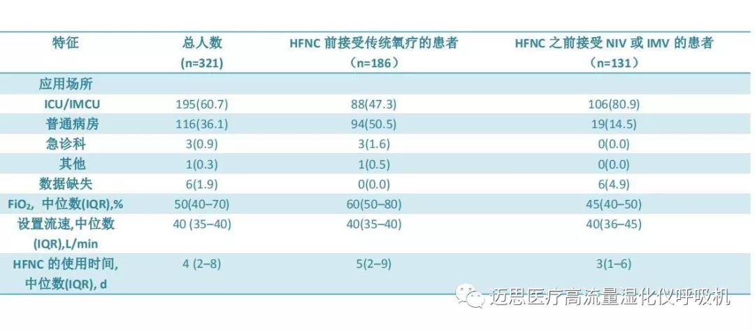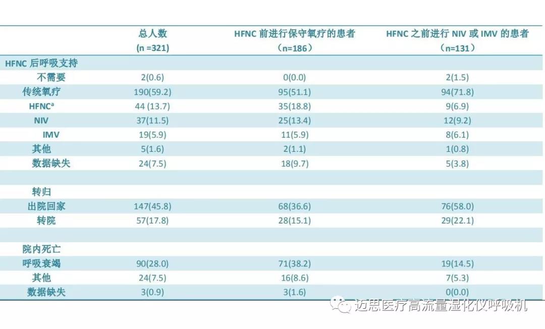 d在進(jìn)行HFNC前,120名患者接受了傳統(tǒng)氧療,其中53名為無(wú)創(chuàng)通氣NIV,45名為有創(chuàng)機(jī)械通氣IMV