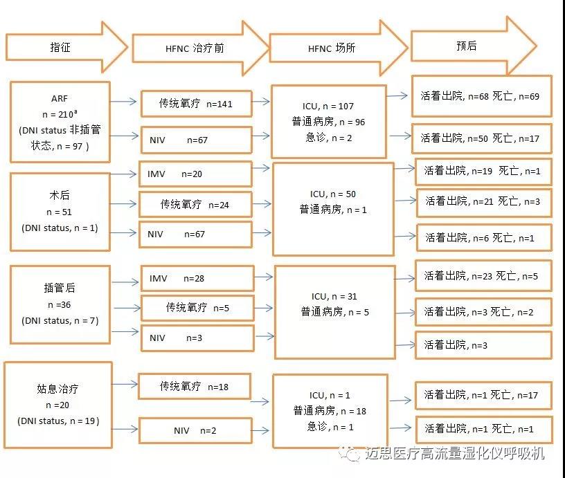 圖1. HFNC的臨床適應(yīng)癥,HFNC治療前,應(yīng)用場(chǎng)所和生存預(yù)后的流程圖。在HFNC使用之前,兩名未接受呼吸支持的患者和一名接受家庭NIV的患者不包括在流程圖中。